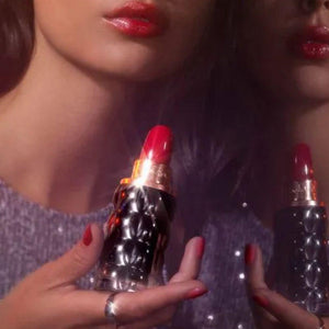 Frasco elegante em formato de lábio estilizado, representando sensualidade e feminilidade, disponível em diferentes tamanhos de Eau de Parfum.