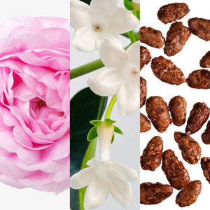 Notas de Coração: Jasmim, Flor de Laranjeira Africana, Canela, Rosa, Pralinê.