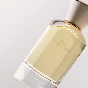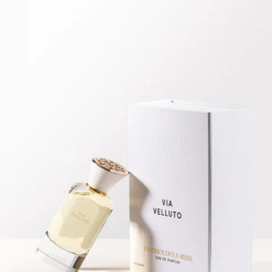 Integrante da coleção de perfumaria de nicho da Fabbrica Della Musa, Via Velluto foi concebida para expressar uma sensação de suavidade e luxo, evocando a textura aveludada que dá nome à fragrância. A composição abre com notas frescas e vibrantes que despertam os sentidos, evolui para um coração floral e levemente especiado que adiciona profundidade, e culmina em uma base rica e quente de madeiras, âmbar e almíscar, proporcionando presença marcante e duradoura.