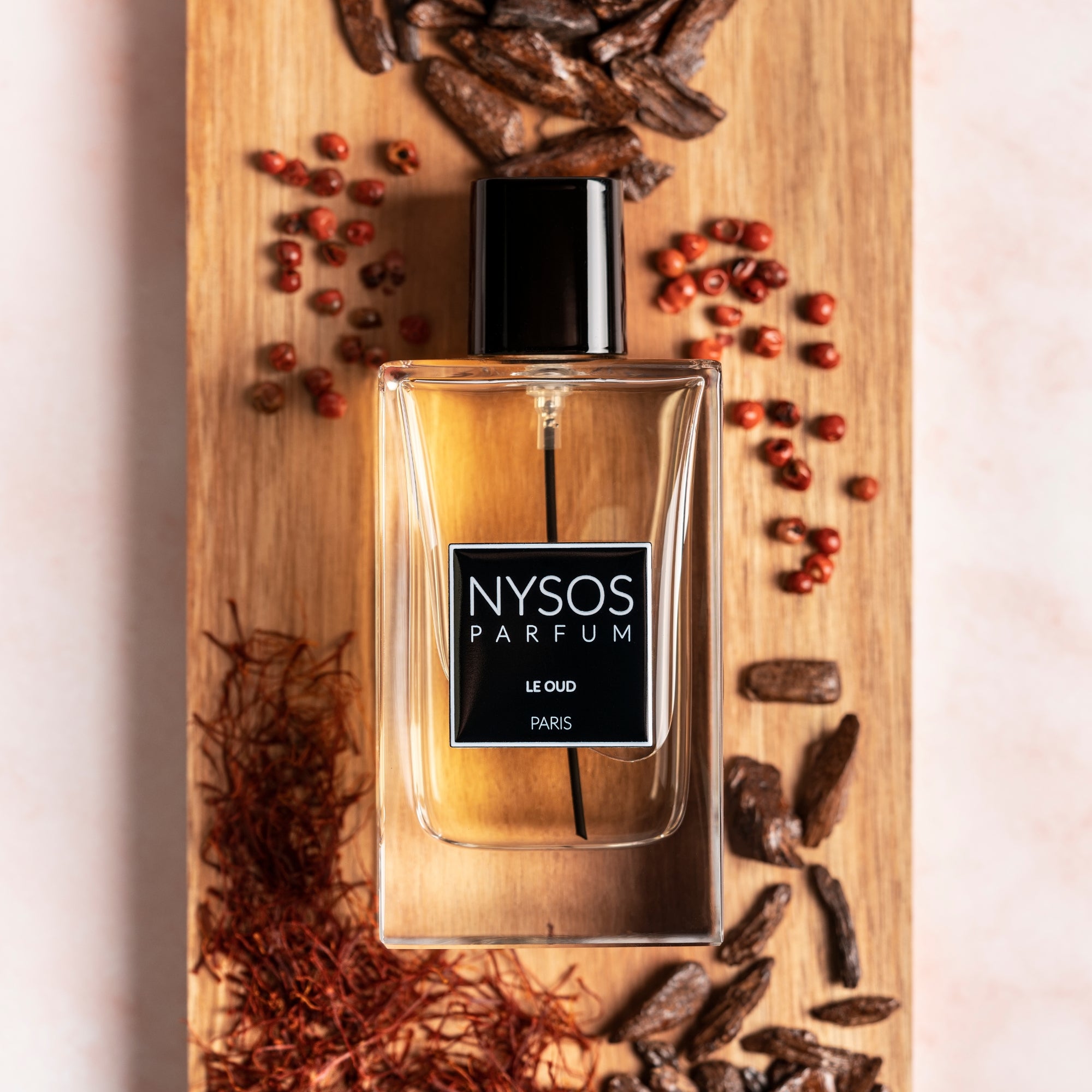 Nysos Le Oud integra a linha de fragrâncias da Nysos Parfum com foco em composições orientais e amadeiradas sofisticadas. A fragrância abre com um acorde vibrante de pimenta rosa, incenso e bergamota, que traz um início picante com leve frescor cítrico. No coração, destacam-se açafrão, rosa turca e couro, proporcionando profundidade e textura olfativa. A base é sustentada por oud (madeira de agar), benjoim, patchouli, madeira de âmbar, sândalo e âmbar cinzento, conferindo riqueza e durabilidade à evolução da fragrância.