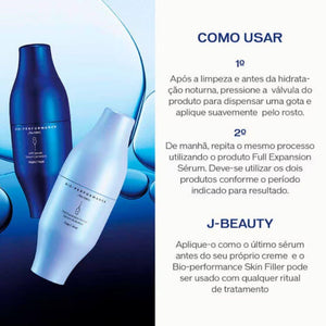 O Shiseido Bio-Performance Skin Filler Refill contém os dois cartuchos essenciais do tratamento: Infill Serum (Noturno) e Full Expansion Serum (Diurno). Juntos, eles proporcionam uma ação de preenchimento contínua e intensa, atuando sobre rugas, perda de volume e flacidez. O Infill trabalha durante a noite para compactar o ácido hialurônico em nanoestruturas que penetram mais profundamente na pele. O Full Expansion, aplicado pela manhã, libera e expande essas moléculas, promovendo volume e sustentação instantâneos.